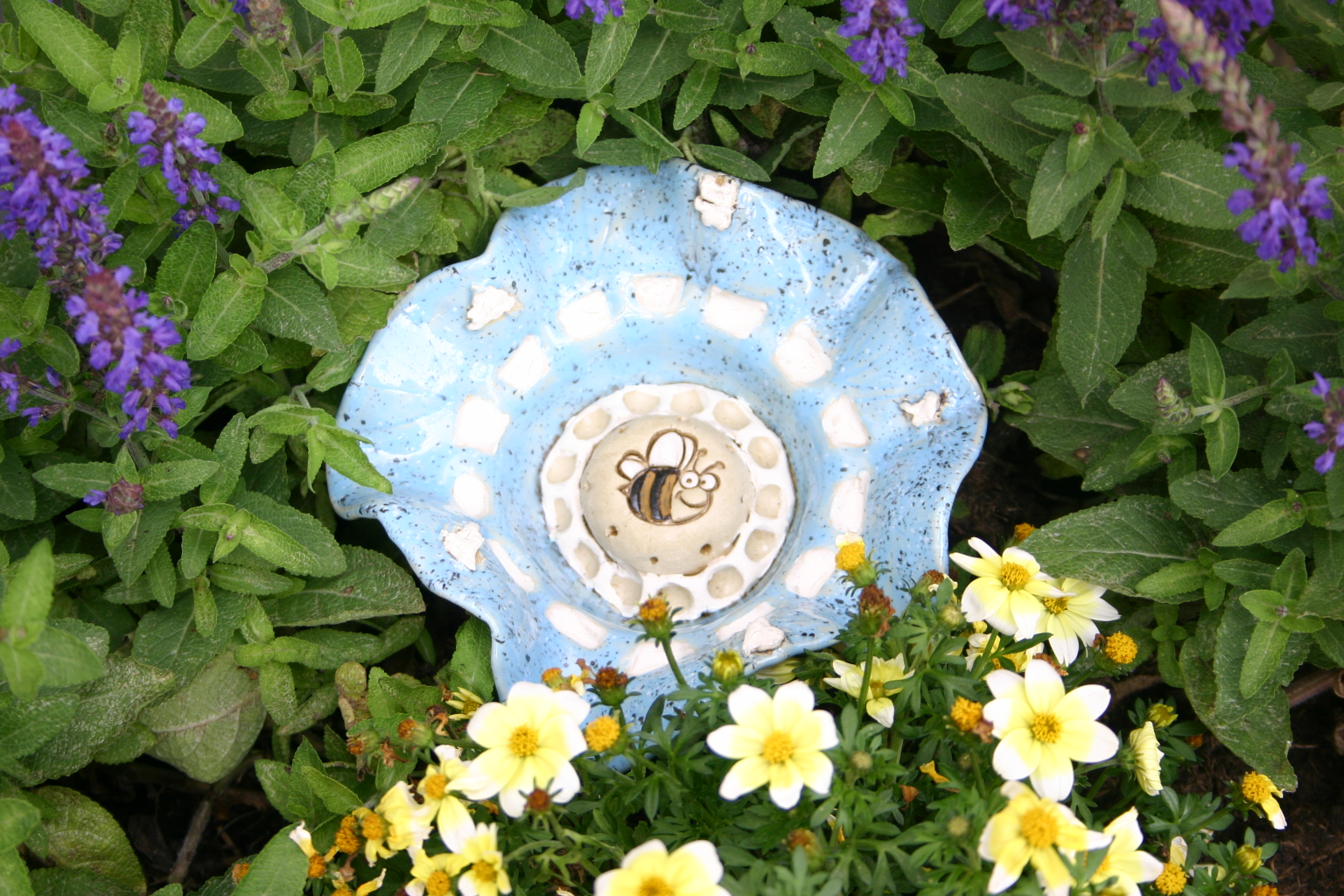 Mit dieser leuchtenden und für Insekten gut sichtbaren Tränke hilfst du ihnen nicht nur über heiße und trockene Sommertage/-monate, sondern hast zudem einen tollen, sommerlichen Blickfang in deinem Garten. Verschiedene Details auf und in der Tränke wurden matt und utschfest glasiert, damit die Tierchen einen sicheren Landeplatz finden und wurden so angesetzt, dass sie - egal ob die Tränke ganz voll, halb voll, oder nur noch viertel voll ist - Halt finden.