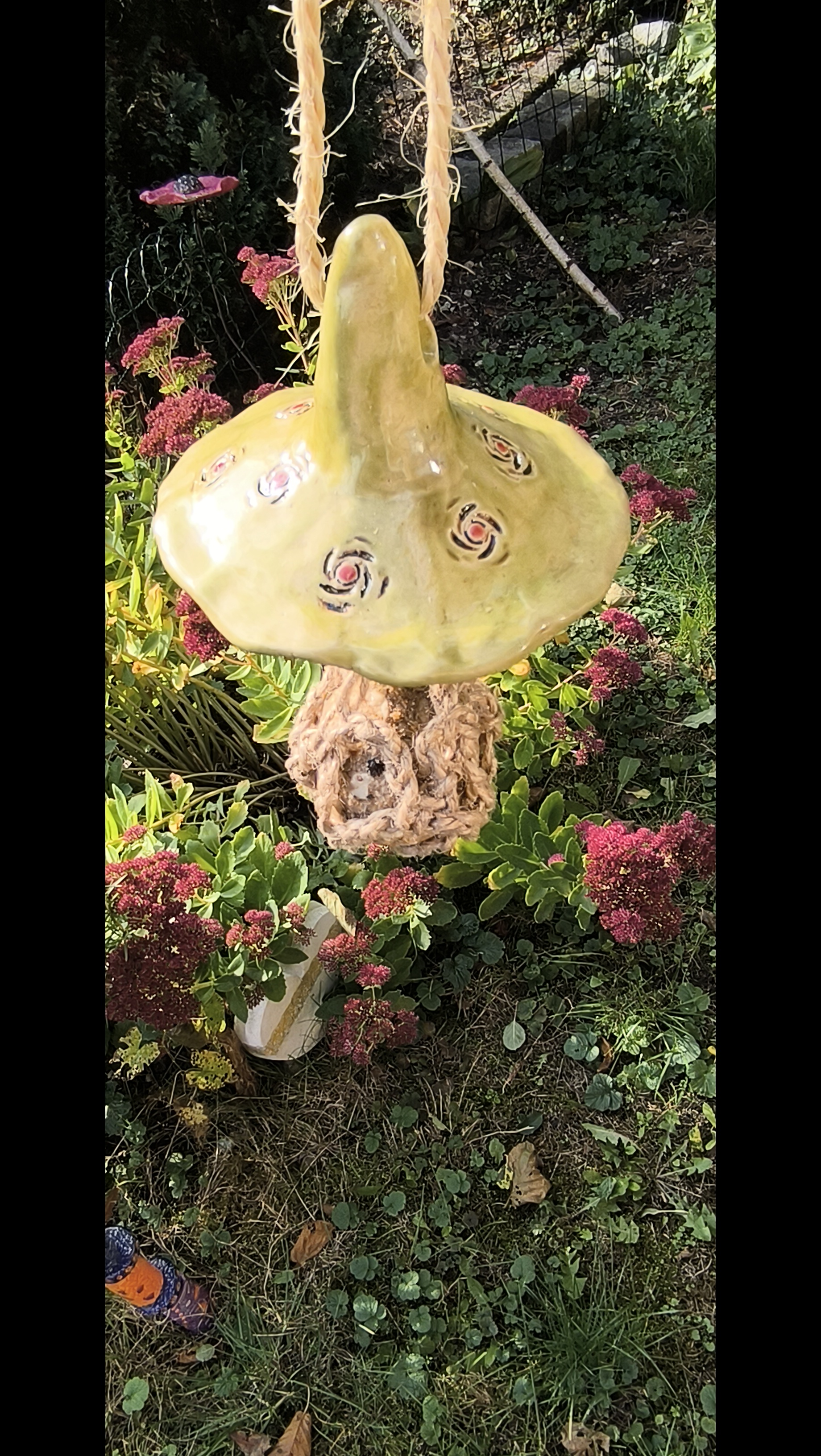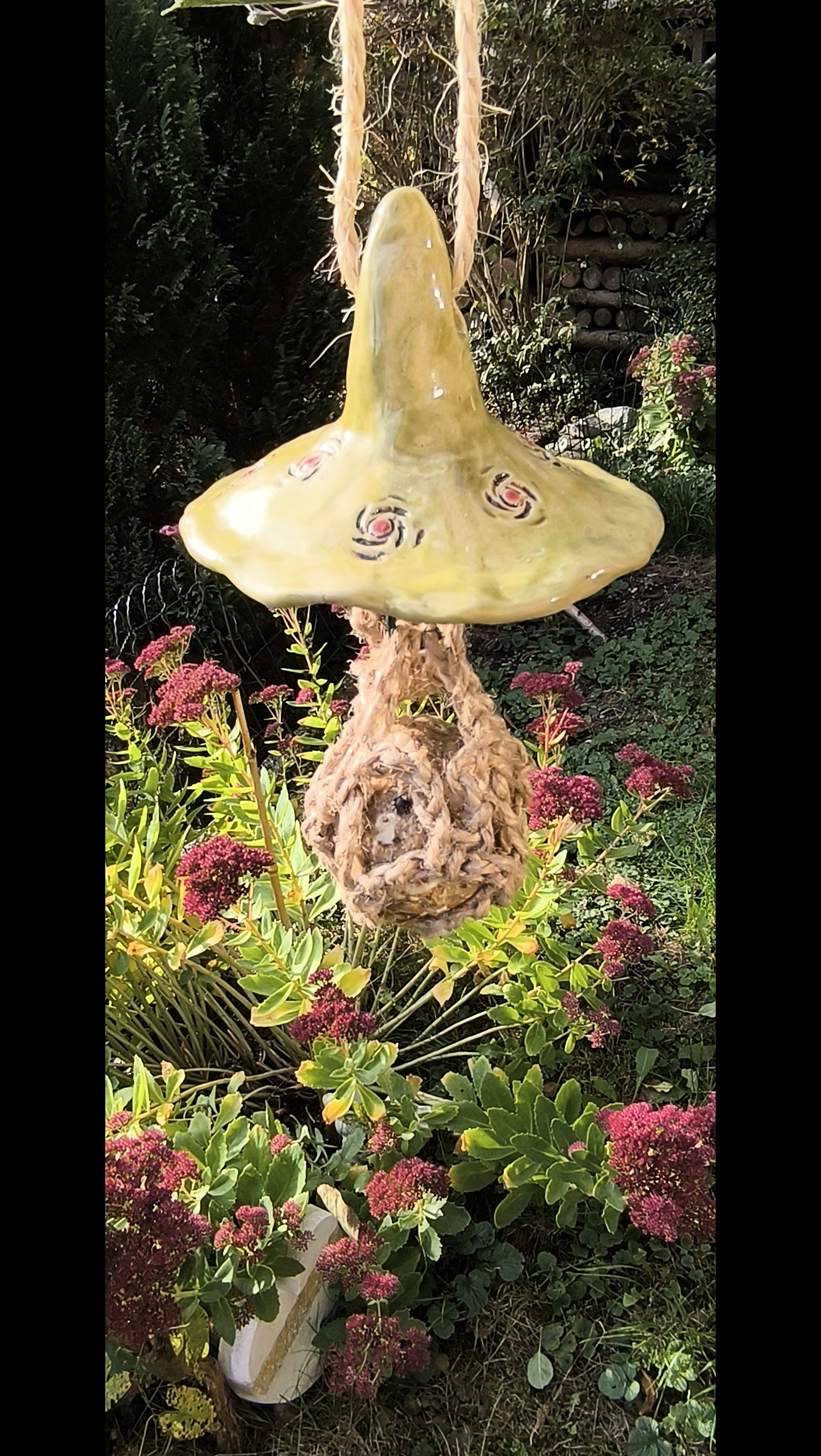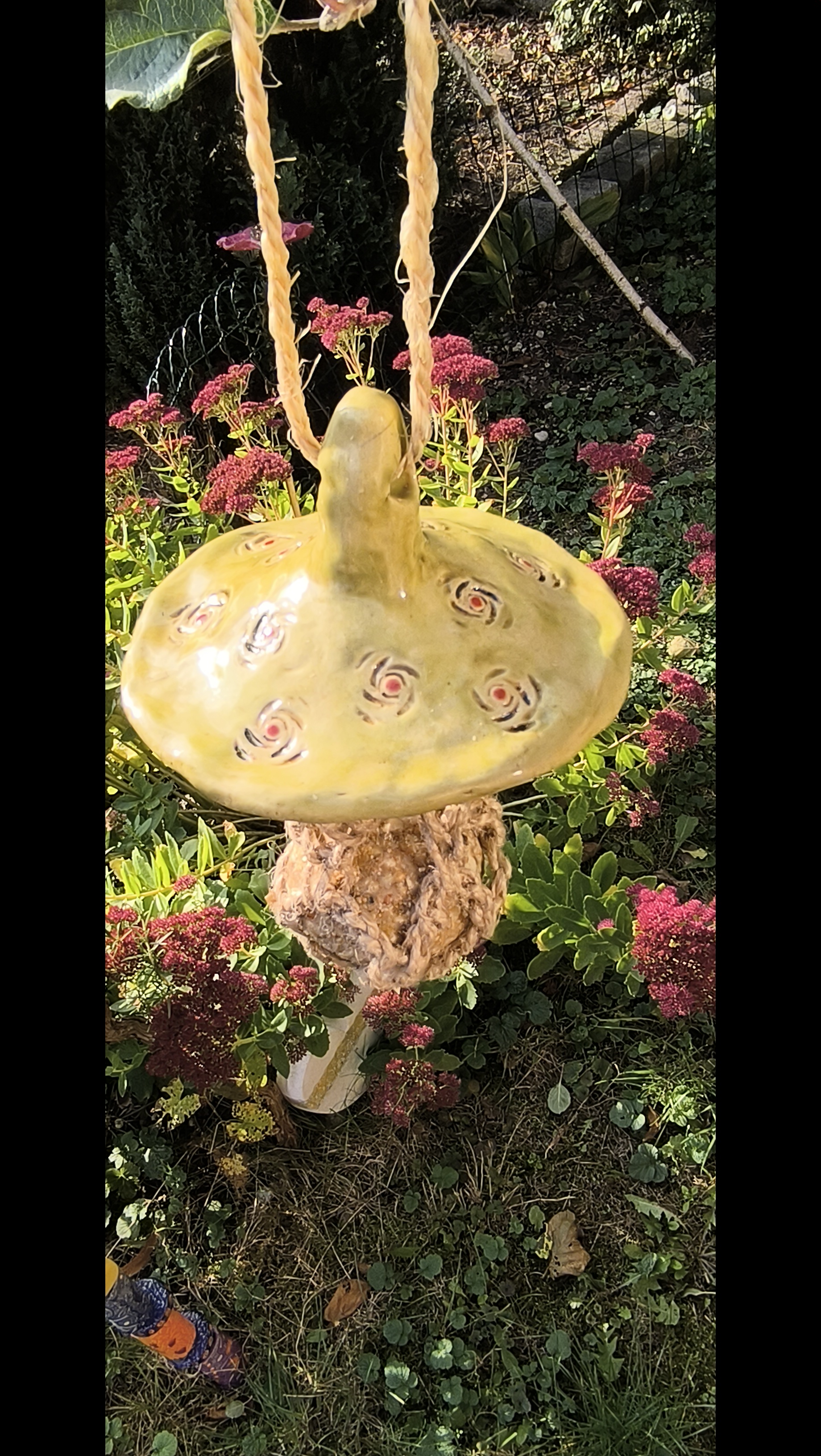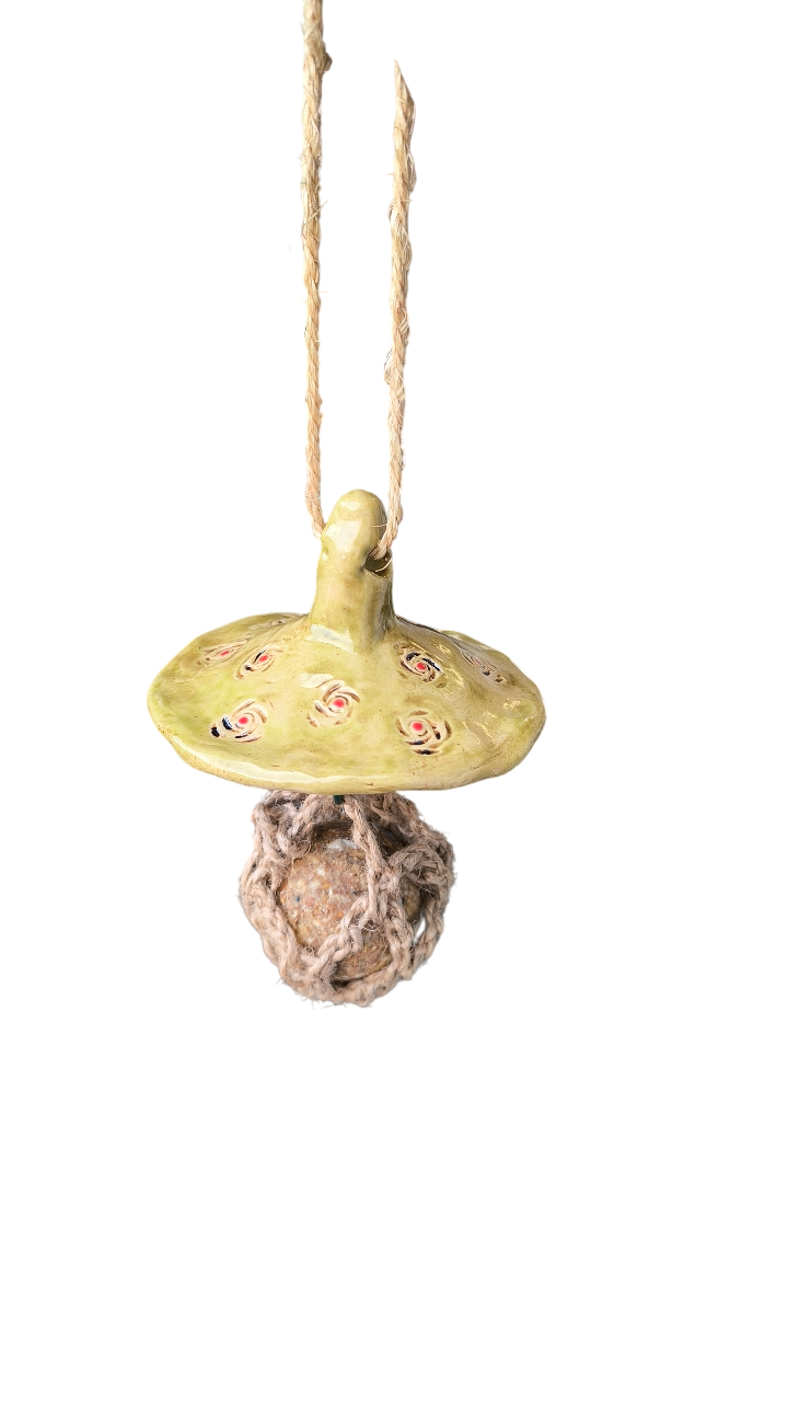Hübscher, handgefertigter Meisenknödelhalter aus Keramik. Das Meisenknödeldach ist für unsere Gartenvögel sehr nützlich und hilfreich und gleichzeitig ein hübscher Blickfang für deinen Garten oder Balkon.